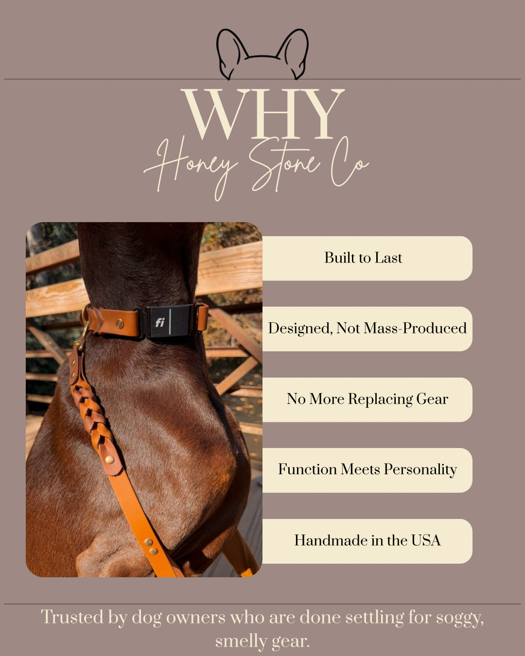 At Honey Stone Co, we’re proud to be Verified Fi Makers, meaning our dog collars are officially approved to integrate seamlessly with the Fi GPS tracking system. Being verified means we meet Fi’s highest standards for quality, durability, and fit—so your pup stays safe and stylish. Unlike others, we handcraft each collar with premium materials and a personal touch, combining tech and charm in every piece. 🐾