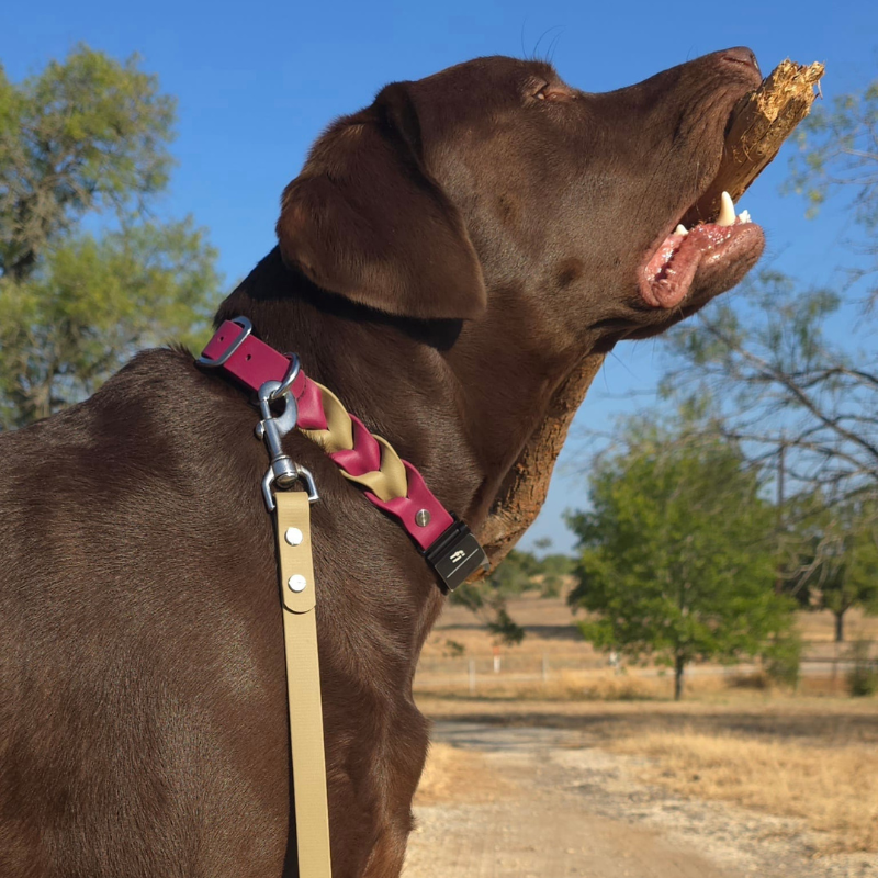 Made from waterproof, stink-proof Biothane®, it’s built to handle muddy hikes, rainy walks, and everyday adventures—all while wiping clean in seconds. The braided detail adds a timeless, handcrafted look, while Chicago screws ensure lasting strength and easy adjustments when needed.